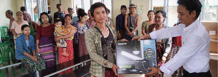 寄贈先は、ミャンマー南西部の山間部に位置するベーネークイン村。ソーラーストレージの寄贈式は現地の高校で実施しました。寄贈式ではARTICスタッフのZaw Lin氏から村人に直接ソーラーストレージを配布しました。今回は、ベーネークイン村の全世帯に1台ずつ、全140台を寄贈しました。今回お届けしたソーラーストレージは、村人に無償で寄贈されるものではなく、2年間にわたりソーラーストレージの使用料として月額9000チャット(約580円)を集めます。目的は子どもたちの教育機会の創出に向けて村に新たな図書館を建設するためです。他の人からの施しを受けるだけではなく、自らも努力をすべきというARTICさんの活動信念に基づいています。
