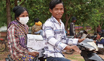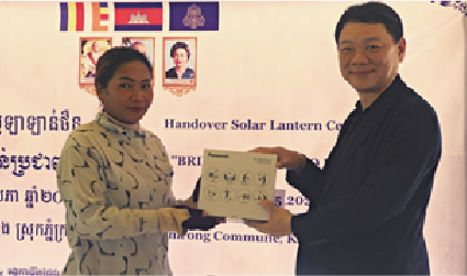 今回の寄贈先は、カンボジア プルサット州のライング・キヴァヴ村。首都プノンペンから陸路で約1日半もかかる、約200世帯が暮らす農村です。村の小学校で引き渡し式が開催され、カンボジアの5つの州で活動を展開する団体、ライフ・ウィズ・ディグニティ(LWD)を通じて、低所得世帯や障がい者がいる90世帯にソーラーランタンが配布されました。カンボジアの中学校進学率は約17%で、特に地方の農村部では家の手伝いなどで留年してしまう子どもたちが多いという現状をふまえ、ソーラーランタンは主に家庭で、夜間の学習や読書に役立ててもらう予定です。