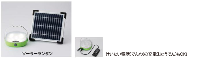 下(した)の写真(しゃしん)を見(み)てみましょう。左(ひだり)の丸(まる)いかたちのものが「ソーラーランタン」です。「ソーラー」は英語(えいご)で太陽(たいよう)のこと、「ランタン」はあかりのことをいいます。右(みぎ)にある黒(くろ)い板(いた)は、太陽(たいよう)の光(ひかり)をうけて、充電(じゅうでん)(電気(でんき)をためること)するきかいです。