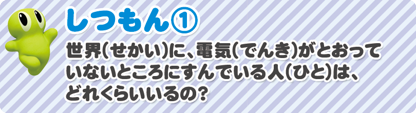 わたしたちが毎日(まいにち)つかっている電気(でんき)。でも、世界(せかい)には、電気(でんき)がとおっていないところでくらしている人(ひと)たちもたくさんいるんだ。