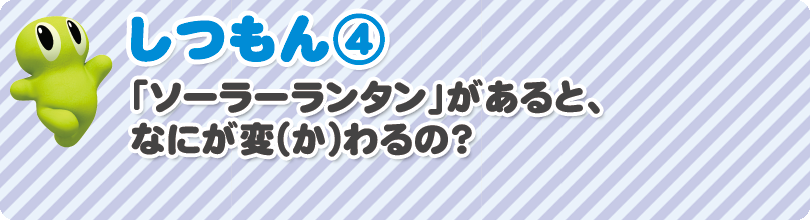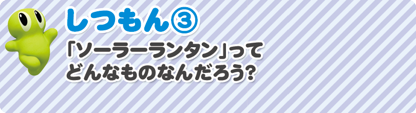 それでは、しつもんに挑戦(ちょうせん)してみよう!わからなかったら、こたえをよくよんで、パナソニックのソーラーランタンについて学んじゃおう!