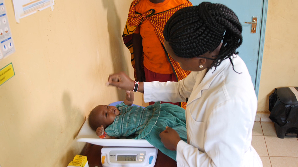 同じくエランガタ・エンテリット診療所で子どもの身長、体重などを測定する准医師。 ©World Vision