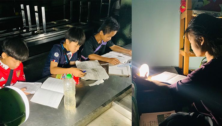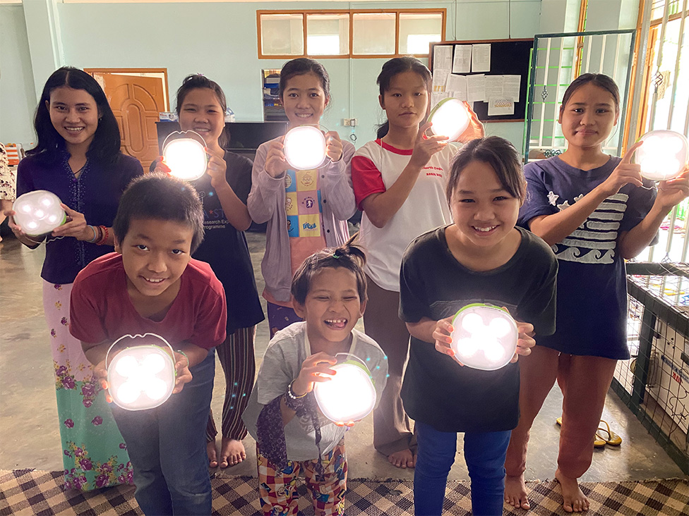 一方、ミャンマーでは、軍事クーデータによる国情の不安定化が原因で、停電の頻度が上がっています。これは、児童養護施設「Dream Train」でも、子どもたちの日常生活に大きな影響を与えています。Dream Trainで暮らすのはHIV孤児や貧困度の高い少数民族家庭など、人身売買のリスクが高い子どもたちです。大学への進学を目指す子どもたちも多く、夜間の停電中でも学びを支えるための“あかり”が必要とされています。そこで、ソーラーランタンを活用することで、いつ停電が起きても子どもたちが学び続けられる環境を実現することができました。