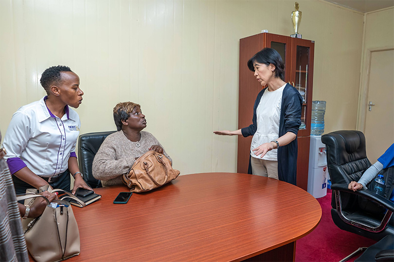 ケニア行政機関(左)や県政府のジェンダー局(中央)と連携し、JICAの久保田さん(右)がプロジェクトの様々な取組に奔走します