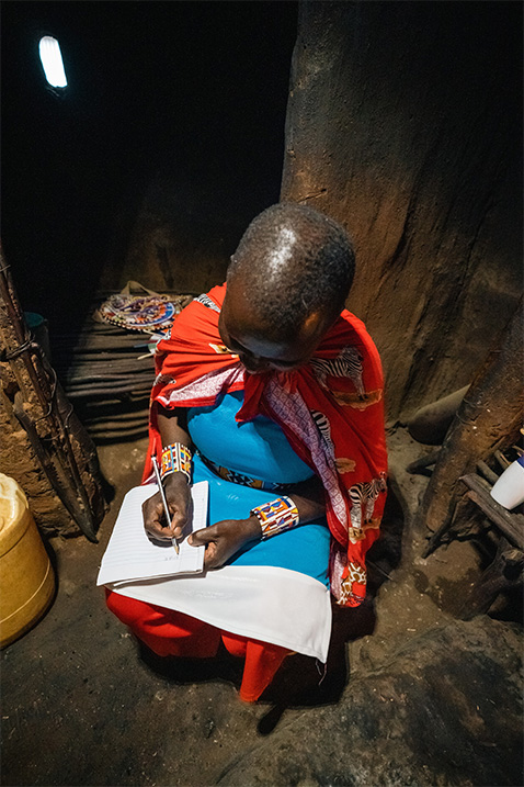 パナソニックのソーラーランタンは、GBVのないスマートビレッジをつくるこの取り組みに活用されます。例えば「成人識字プログラム」では、女性たちは日中、家事や家畜の世話など、作業に追われる中、識字教室に通いますが、これでは勉強時間が足りません。しかしランタンがあれば、夜間も家でノートを広げ、学習ができるようになります。