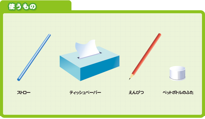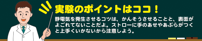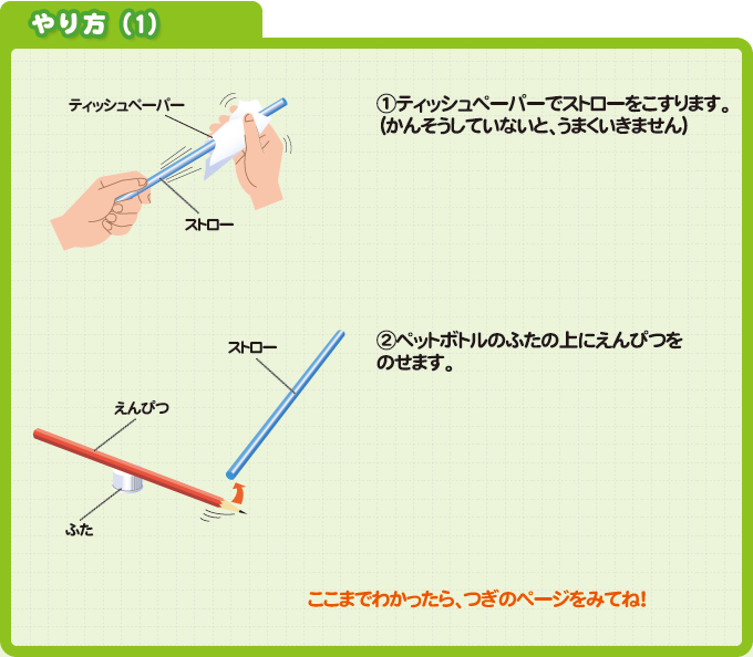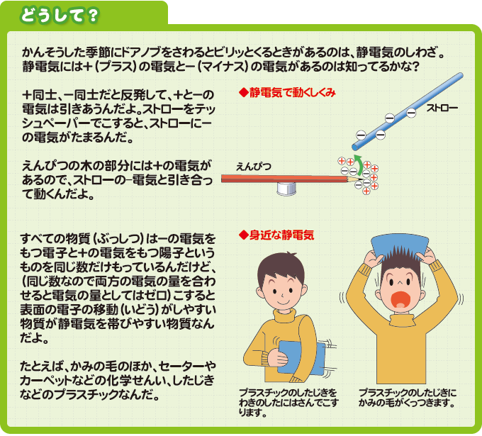 したじきをセーターでこすってから、かみの毛に近づけるとかみの毛がくっつく遊び、やったことある?かみの毛がくっつくのは静電気のせいだよ。ストローとえんぴつを使って、静電気の実験をしてみよう!