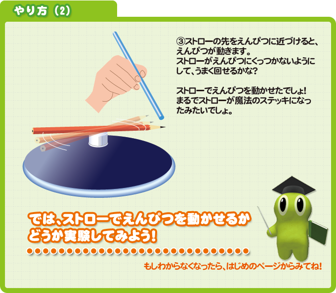 ストローをえんぴつに近づけると、ふしぎ、ふれていないのにえんぴつが動く!ストローは魔法(まほう)のステッキ?その正体は静電気のしわざ!