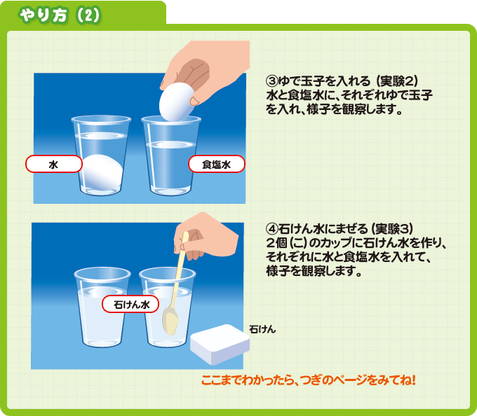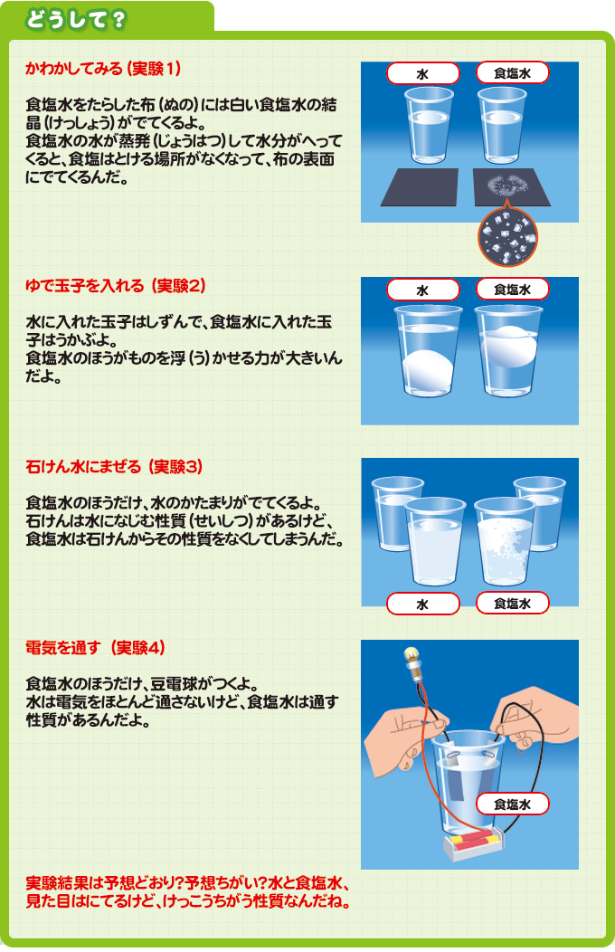 水に食塩をまぜた食塩水は、見た目は水と変わらないよね。食塩水はしょっぱいだけじゃなくて、水とはいろいろなちがいがあるんだよ。そのちがいを実験してくらべてみよう!