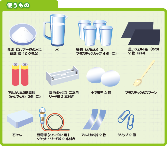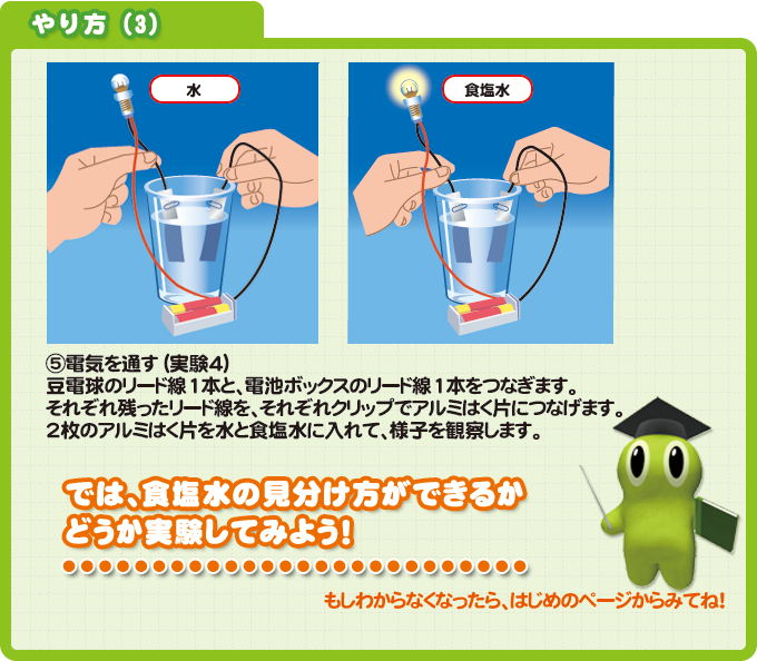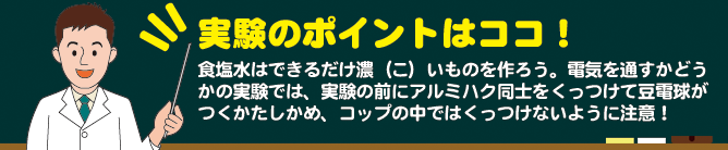 (実験4)では食塩水につけたアルミはくに電気を通すと気体が出てくるので、実験は換気(かんき)のいいところで行おう!