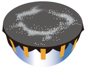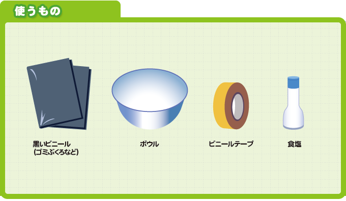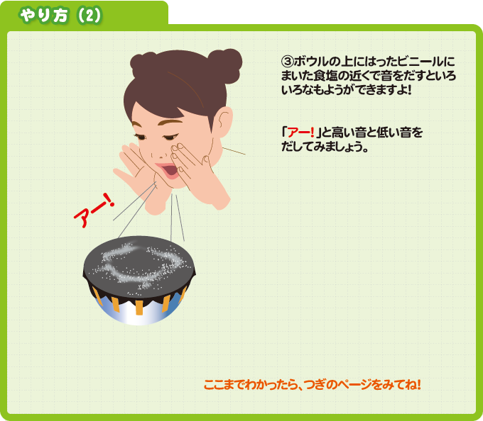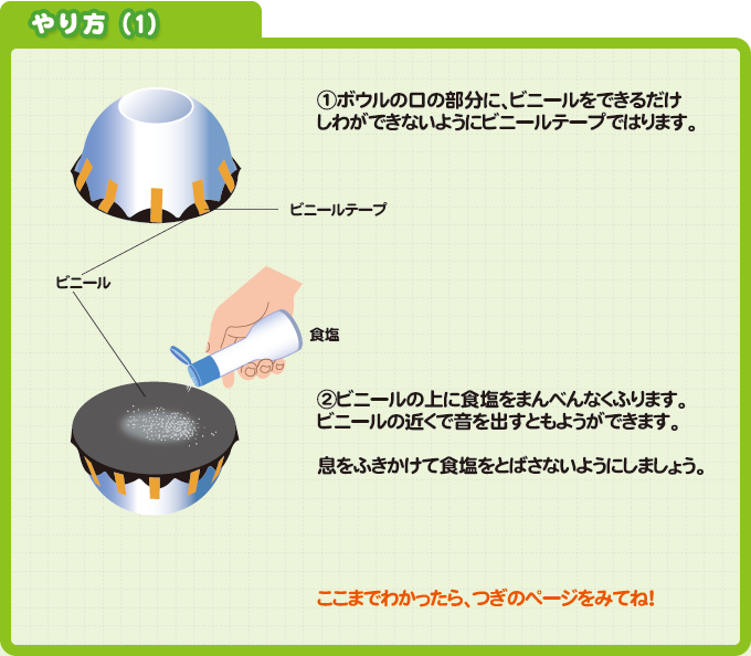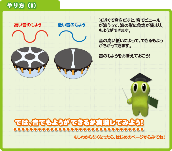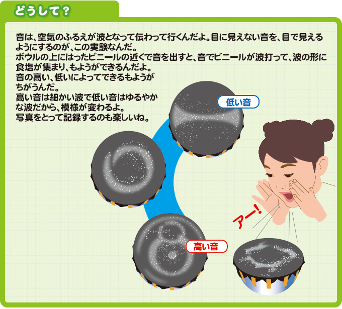 音が出ると空気がふるえるのって、知ってる?高い音、低い音、大きい音、小さい音ではふるえ方がちがうんだ。ボウルの上にはった黒いビニールに食塩をまいて、近くで音を出すと、いろんなもようができるんだよ。ためしてみよう!