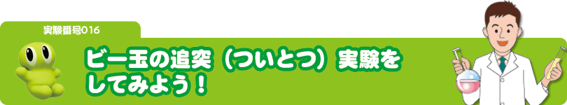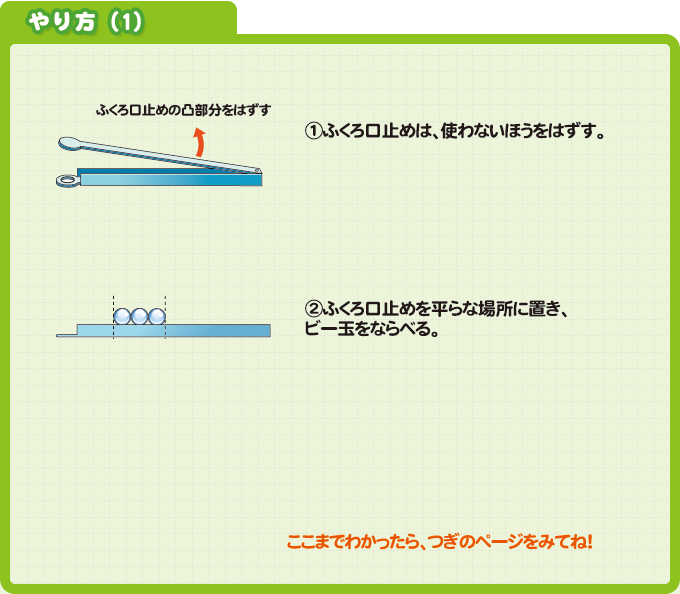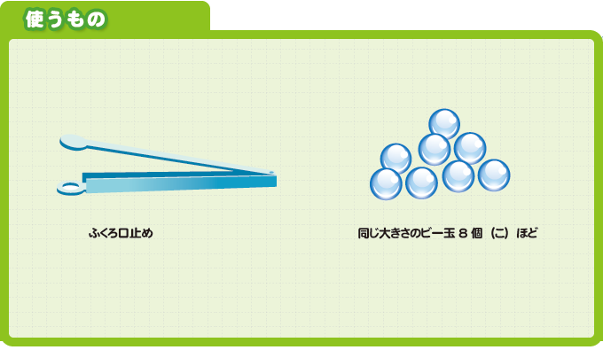 ビー玉を、長めのふくろ口止め(100円ショップでも手に入るよ!)にならべて、追突(ついとつ)実験!はなれたところから1個(こ)、2個、3個、とぶつけてみよう。当てたビー玉はいっしょに動く?はねかえる?それとも動かない?当てられたビー玉は何個動く?予想してから始めよう!