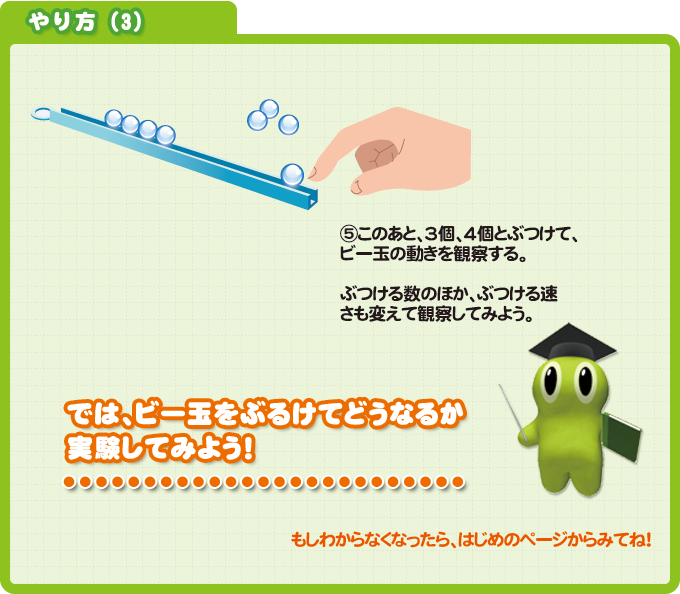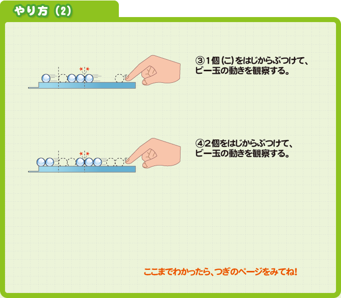 ならべたビー玉に、はなれたところから1個(こ)ぶつけるとどうなるか?2個ぶつけるとどうなるか?予想してみよう!そして実験!