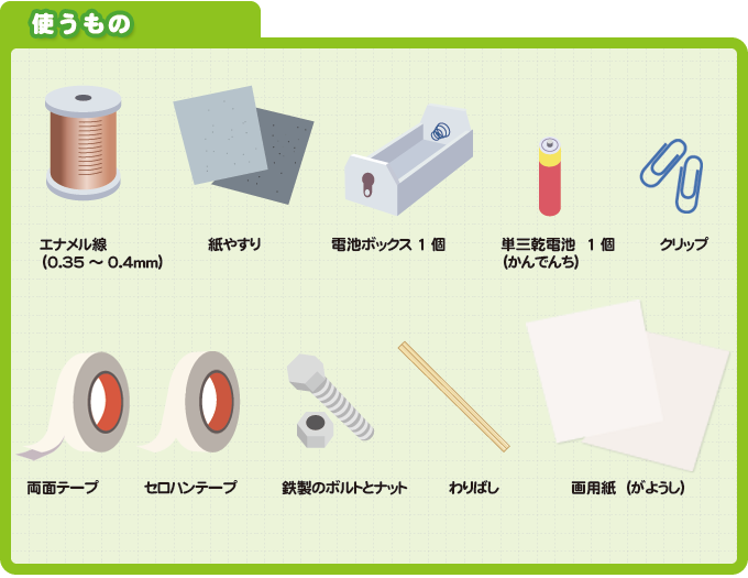 電気を使うと鉄などの金属が磁石(じしゃく)になるんだ。これを電磁石(でんじしゃく)というよ。