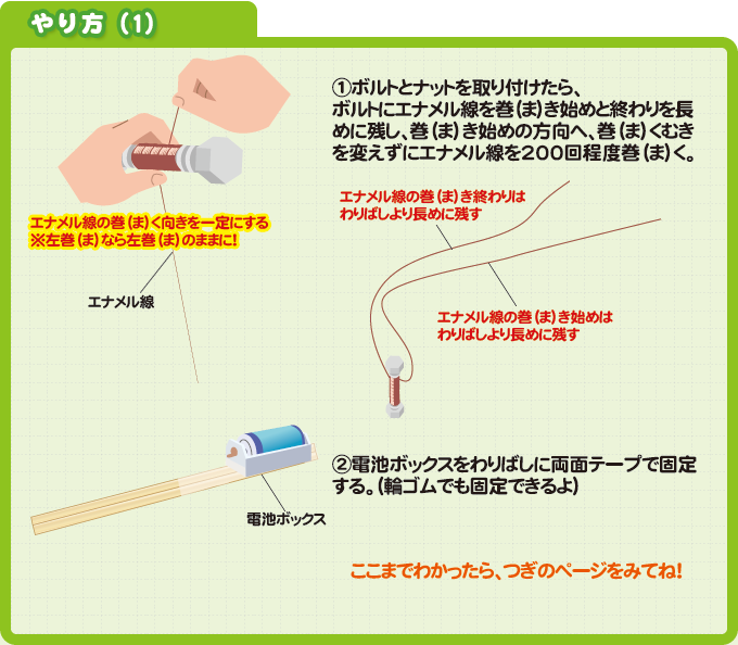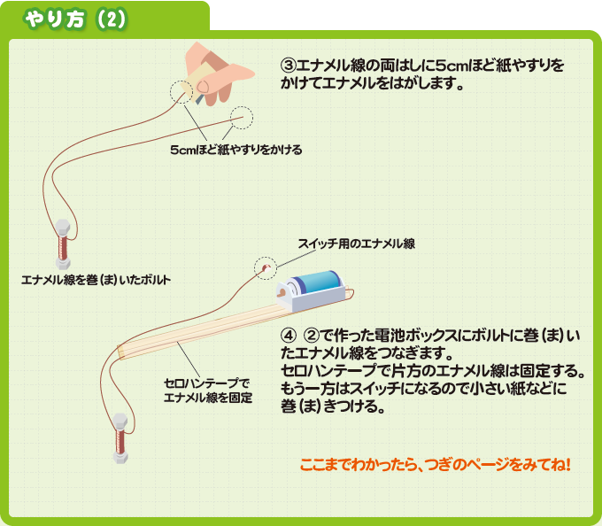 電池とコイルをつないだままにするとコイルが熱くなるよ。