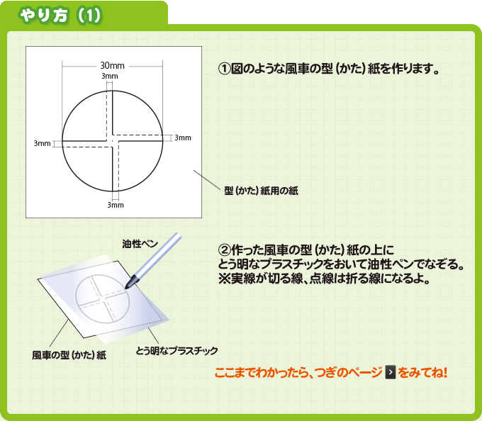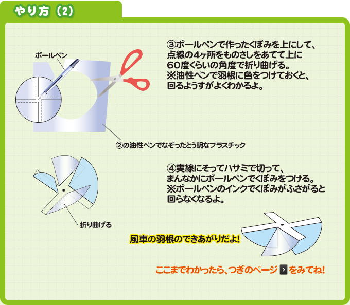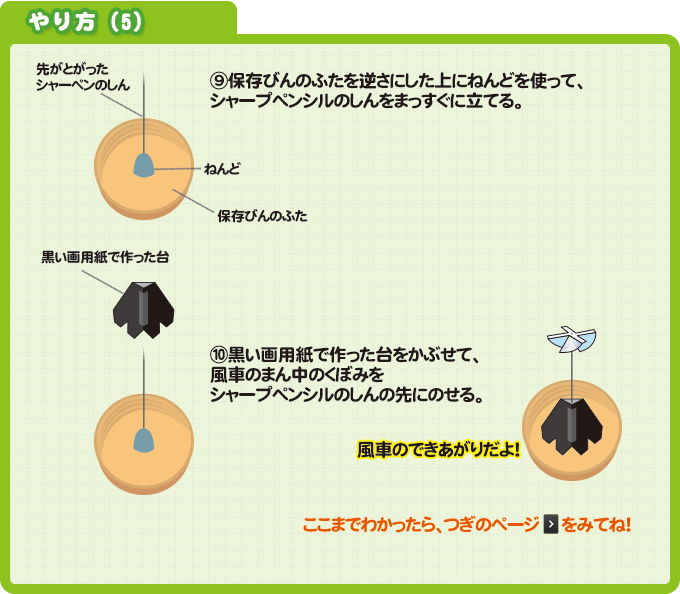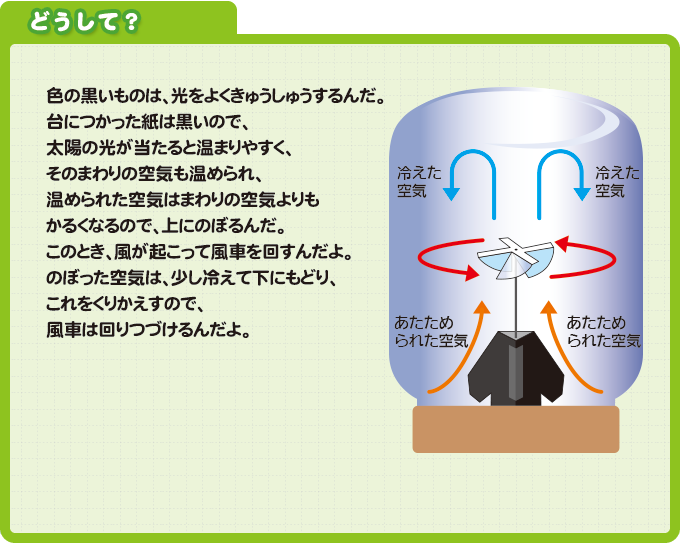 黒い色のものは、光をよくきゅうしゅうすることをりようして、風がないところで回る風車を作ってみよう。どんなときにまわり、どんなときにまわらないのか実験(じっけん)してみよう。