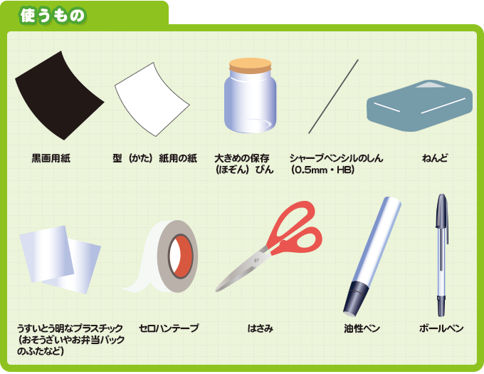 ほとんどの材料は、おうちの中にあるものや、雑貨(ざっか)・ホビー用品のチェーン店やホームセンターなどであつかっているものだよ。おとなの人と相談して材料を集めてみよう!