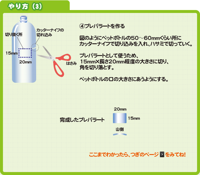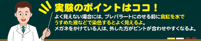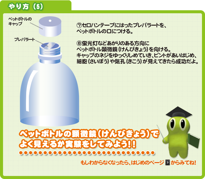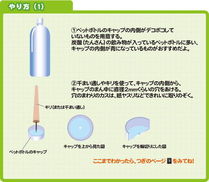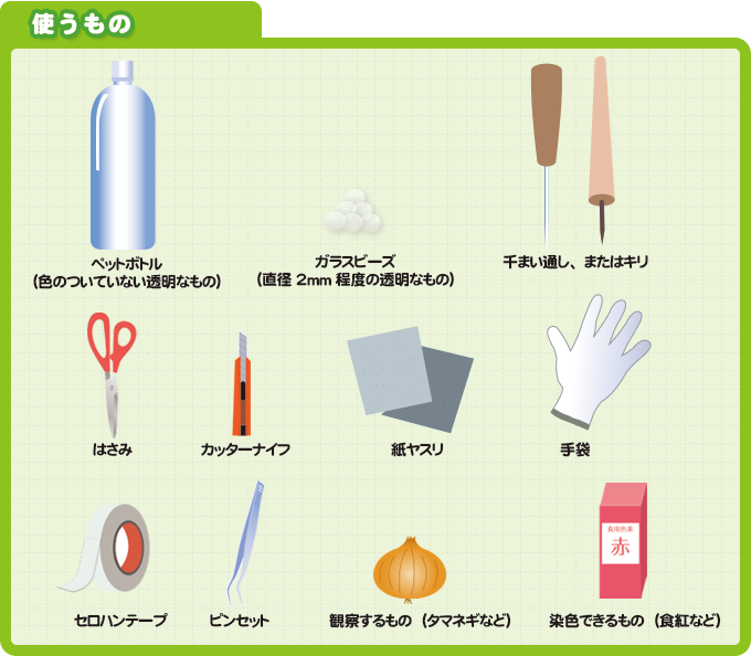 千まい通し(キリ)、カッターナイフ、はさみを使う時には、ケガをしないように、十分に注意しようね。ペットボトル顕微鏡(けんびきょう)で太陽を直接見ないでね。失明する可能性あるよ。