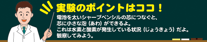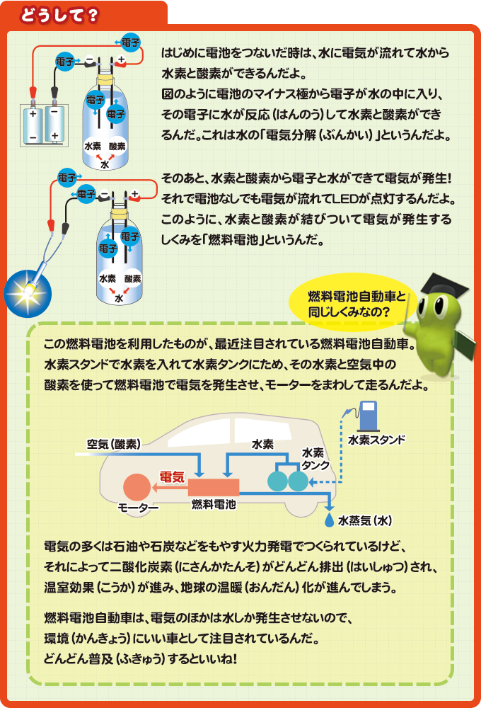 水は水素(すいそ)と酸素(さんそ)でできているって知ってる?水に電気を流すと水素と酸素を発生し、ぎゃくに水素と酸素が結びつくと水と電気が発生するんだ。その時発生した電気を取り出すしくみを「燃料(ねんりょう)電池」というんだよ。