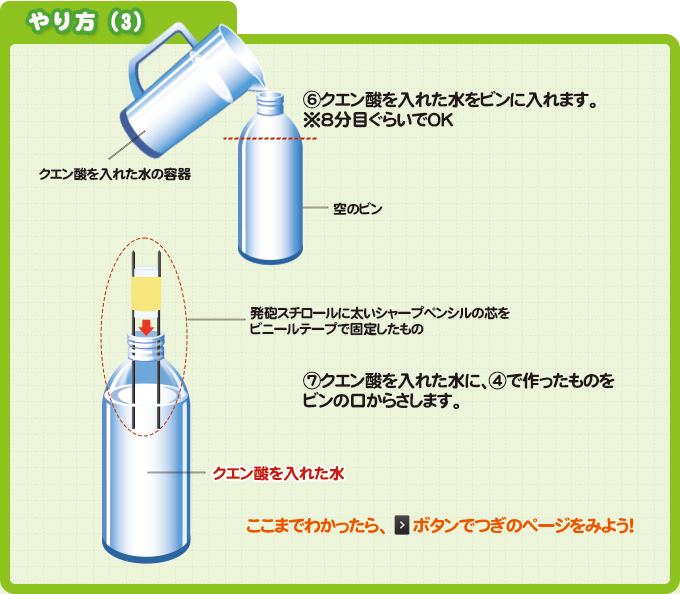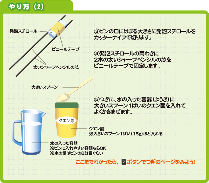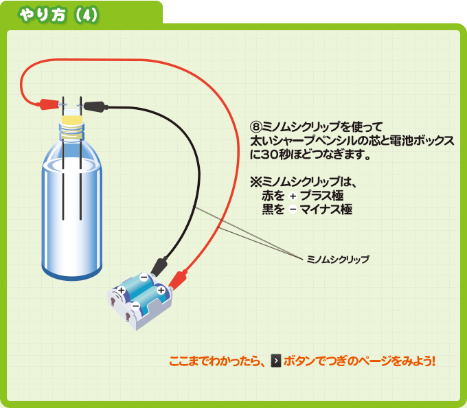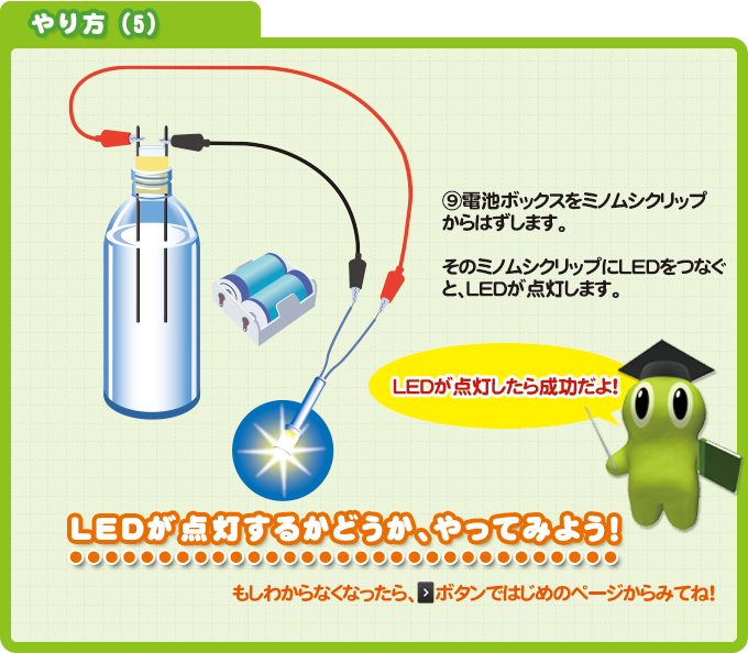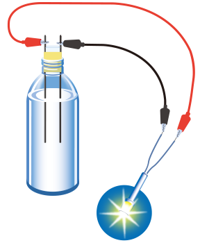 今回の実験では、ビンの中に電気を通して水素と酸素を発生させ、それらが結びついてビンの中の水が電気を通す状態(じょうたい)になるか、電池をつないでいなくてもLED(エルイーディー)を点灯させることができるか、に注目!じっさいに「燃料電池」を作ってたしかめてみよう。