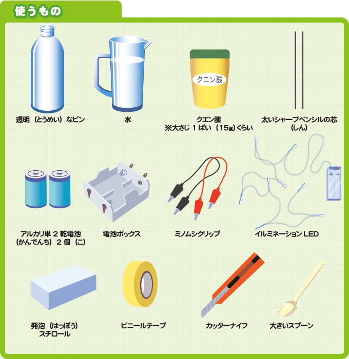ほとんどの材料は、おうちの中にあるものや、インターネット、雑貨(ざっか)・ホビー用品のチェーン店やホームセンターなどであつかっているものだよ。 おとなの人と相談して材料を集めてみよう!