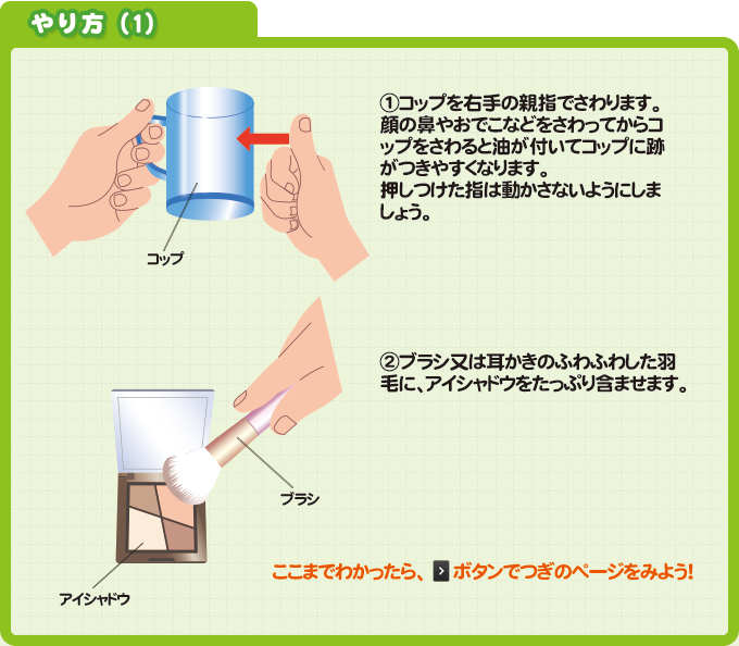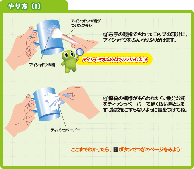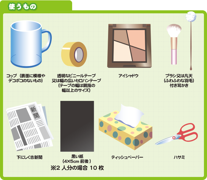 コップに指紋を付けてアイシャドウをふりかけ、余分な粉を払ったら、テープをくっつけてテープに指紋を移す。それを黒い紙にはると、指紋の様子がバッチリ見えるよ。