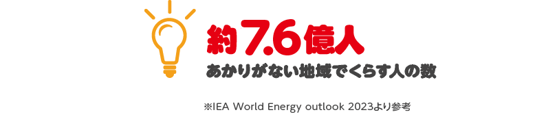 電気(でんき)のない生活(せいかつ)をしている人(ひと)の数(かず)は、おおよそ7.6億(おく)人(にん)いて、そのうち、おおよそ80%(ぱーせんと)がアフリカ、おおよそ15%(ぱーせんと)がアジアに住(す)む人(ひと)たちです。電気(でんき)のない場所(ばしょ)のことを「無電化(むでんか)地域(ちいき)」といいます。そこにすんでいる人(ひと)たちは、電気(でんき)がないので、夜(よる)は、「灯油(とうゆ)ランプ」という油(あぶら)を燃料(ねんりょう)にした暗(くら)いあかりや、ろうそくの光(ひかり)などで生活(せいかつ)しています。