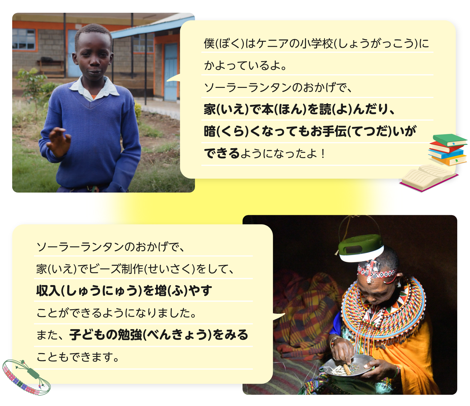 「ソーラーランタン」があることで、それまで、暗(くら)くてねむるだけだった夜(よる)のあいだに、勉強(べんきょう)やしごとができるようになるし、もし夜中(よなか)におなかがいたくなっても、病院(びょういん)に行(い)ってお医者(いしゃ)さんにみてもらえます。