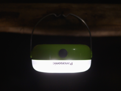 パナソニックのソーラーランタンは、小(ちい)さくて、かるくて、あかるい、つかいやすいランタンです。W(ダブル)のかたちをした取(と)っ手(て)がついているので、手(て)でもって家(いえ)の外(そと)を歩(ある)くこともできるし、天井(てんじょう)からつるしたり、部屋(へや)のかべにかけることもできます。それに、水(みず)をはじく”防水(ぼうすい)機能(きのう)”により、すこしくらい水(みず)でぬれてもへいきです。