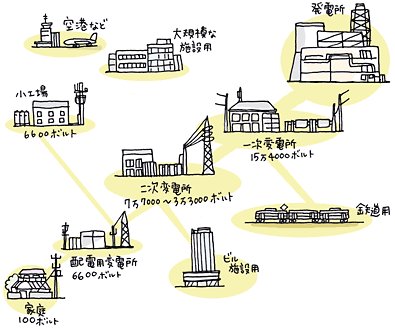 でも、そこで作られた電気はとても力が強い。だから、みんなの家に届(とど)ける前に、変電所(へんでんしょ)で強さを調節しているんだ。だからみんなの家に届くころには、安全に使える100ボルトの力になっているんだよ。