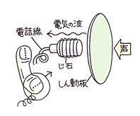 話器の中にある振動板(しんどうばん)は、糸電話の紙コップが声の震(ふる)えを糸に伝えるような役目をしている。そして糸の代わりが電話線というわけ。電話線の中では音が電気の波に変わって、遠くの人まですぐに届(とど)いちゃう。届いた電気の波は、また振動板に伝わって声になるんだよ。