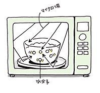 冷たい水の時は水分子がゆっくり動いているけど、お湯の時は激(はげ)しくぶつかり合って、ぶつかったエネルギーで熱を出す。ということは、食べ物を温めるには、中の水分子を激しく揺(ゆ)らすといいんだよ。