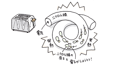 そして、トースターやアイロンなど熱を出す電気製品には、ニクロム線という電気を流しにくい金属の線が入っている。ニクロム線に電圧を加えると、ニクロム線内部で自由電子と原子がぶつかることによって生じる振動で、ニクロム線が発熱する。それで、トースターの熱でパンを焼けたり、アイロンの熱でシャツの生地のシワをまっすぐにのばしたりできるんだよ。