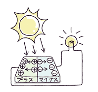 太陽電池の中には、不思議な部品があるんだよ。その部品は太陽の光が当たると、そこでできた電気を、プラスの電気を集める部品とマイナスの電気を集める部品に分けてくれる。電気はマイナスの電気がプラスの方に引き寄(よ)せられれば流れるから、そんな不思議な部品を発明できたんだね。