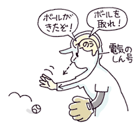 本当だよ。みんなの体の中には、いつも弱い電気が流れているんだ。例えば野球をしている時、転がってきたボールを目で見たら、体の中で何が起こると思う? 見たことやしたいことを弱い電気の信号にして、神経(しんけい)が脳(のう)に伝えてるんだ。例えば「ボールが来たぞ」と伝える。そして「ボールを取れ」という脳からの電気信号を神経が手や足の筋肉(きんにく)に伝えれば、ボールが取れるというわけだ。
