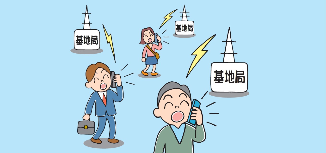 携帯電話は声を電気の信号に変えて、相手に伝えているんだよ。でも、携帯電話から直接相手に電気信号を飛ばしているわけじゃないんだ。携帯電話の電気信号が届(とど)く範囲(はんい)は、せいぜい2km位。だからまずはその範囲の基地局(きちきょく)に信号を送るんだ。
