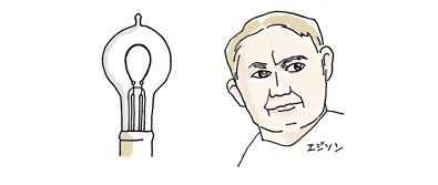 昔は夜の明かりとして油を燃(も)やすランプ、ろうそく、ガス灯などが使われていたけど、あんまり明るくならないよね。そこで登場したのが電気で強い明かりを作る電球。この電球を発明したのは、アメリカの発明王エジソンだよ。