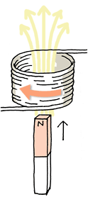 図のように、金属(きんぞく)の線をぐるぐる巻(ま)いたものを「コイル」と言う。この中に磁石(じしゃく)を通してやると、その磁力で、金属の線の中で自由電子が決まった向きに流れ始めることが分かった。