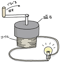 考え方は図のような形。磁石をコイルにかぶせて、これをぐるぐる回すんだ。手で回すと電気が起こる。速く回すと強い電気になる。だけどずっと回しておくのは大変だね。