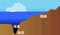 海の底は、平らな形をしているとは限(かぎ)らない。むしろ陸地よりも、複雑(ふくざつ)な地形をしているよ。陸地に近いところでは、やや浅い陸棚(りくだな)がある。そこからどんどん深くなっていって、急に深い溝(みぞ)になっているところがある。これを海溝(かいこう)といい、海溝の中で特にぐんと深くなったところを、海淵(かいえん)とよんでいるよ。