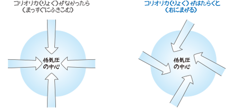 気圧(きあつ)の低い台風の目に流れこむ風を考えてみよう(図)。コリオリ力(りょく)がはたらかないばあいは中心にまっすぐふきこむんだけど、コリオリ力(りょく)がはたらくことで北半球では左巻(ま)きの渦(うず)になるんだ。南半球では右巻(ま)きだよ。