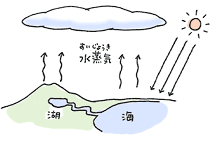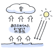 雲はどうしてできるのかな?そのしくみを、かんたんに説明しよう。海や地面から水が蒸発(じょうはつ)すると、水蒸気(すいじょうき)となって空気にとけこむ。この空気が上空へのぼり、冷やされると、水のつぶとなって雲になるんだ。