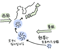 台風は熱帯(ねったい)の海で生まれ、ぐるぐる回転しながら移動(いどう)を始める。その間にも、どんどん大きく育って、勢力(せいりょく)を強めていくんだ。台風は始め、東風におされて西の方へ進み、やがて北へ向かって進んでいく。そして、こんどは西からの風に流されていく。すると、ちょうど日本の上を通るコースをたどるんだ。
