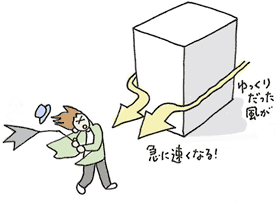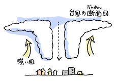 台風の風の強さは、地形によって大きく影響(えいきょう)を受ける。特に海峡(かいきょう)や岬(みさき)、山の尾根(おね)などでは、風が強く吹(ふ)く。大きな建物のあるところでは、ビル風と呼ばれる強い風が発生しやすい。それに、橋の上やトンネルの出口などでも、突然(とつぜん)の強風にあおられることがある。台風が近くにいる時は、なるべく外出しないのが一番だね。