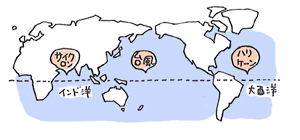 ところで、台風は世界中に仲間がいるって知っているかな?世界中の熱帯の海では、台風と同じような熱帯 低気圧(ねったいていきあつ)が発生している。北太平洋や北大西洋で生まれたものはハリケーン、インド洋で生まれたものはサイクロンと呼ばれている。どれも発生する場所が違(ちが)うだけで、強い風と雨をもたらすところは同じだよ。