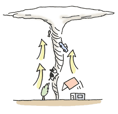 台風と同じで、空気が温められてできる水蒸気(すいじょうき)の雲がもとになる。台風になるにはたくさんの雲がいるけれど、竜巻は小さな雲でも強い風を起こしてしまう。まず竜巻のもととなる雲ができ、雲の下から空気をどんどん吸(す)い上げるんだ。台風が近づいたり天候(てんこう)が乱(みだ)れると、空気の流れが重なってうずまきを作る。このうずまきが集まってくると、まわる早さはいっそう激(はげ)しくなり、下にあるものを強い力で吸(す)い上げて竜巻になるんだ。