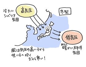 日本の近くで発生する高気圧を見てみよう。冬によく見られる気圧配置(はいち)では、日本の西側に高気圧のシベリア気団(きだん)、東側に低気圧ができている。このような気圧配置を、「西高東低(せいこうとうてい)」または「冬型」とよんでいるよ。