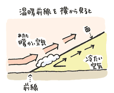 温暖前線とは、冷たい空気と暖(あたた)かい空気がふれあった場所をさす。「線」といってもほんとうは線ではなく、面になっていて、地上から高いところまで続いているんだ。前線の近くではいろんな雲が見られるよ。