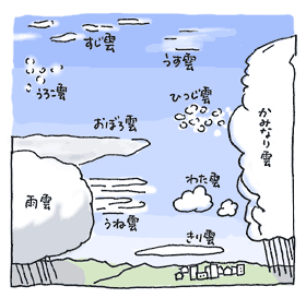 雲はいろんなところで作られる。地表の空気が温められて、上昇(じょうしょう)して雲となったもの。地表の空気が、山をはい上がって雲となったもの。台風の雲のように、海の上で海面の空気が温められて雲となったもの。雲はできかたによって、形や特徴(とくちょう)、それに高さも違(ちが)うんだよ。それぞれ名前がつけられているから、空を見て雲の形を観察(かんさつ)してみよう。