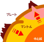プレート同士がぶつかり、動いているのは、プレートのさらに下にあるマントルが関係しているよ。マントルは高い熱でドロドロに溶(と)けた岩石だ。マントルは熱くなるとわき上がり、冷たくなると沈(しず)みこむ。このマントルの動きが、その上にあるプレートを動かしているんだ。