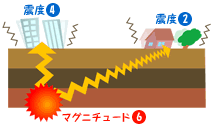 地震の大きさをあらわすのに、震度やマグニチュードという言葉を聞いたことはあるかな。この2つはどうちがうんだろう。震度とは、その場所での揺(ゆ)れの大きさがどのくらいかをあらわしたものだ。いっぽうマグニチュードは、地震そのものの大きさをあらわしたもの。マグニチュードが大きい地震でも、そこから離れたところでは震度は小さくなるよ。